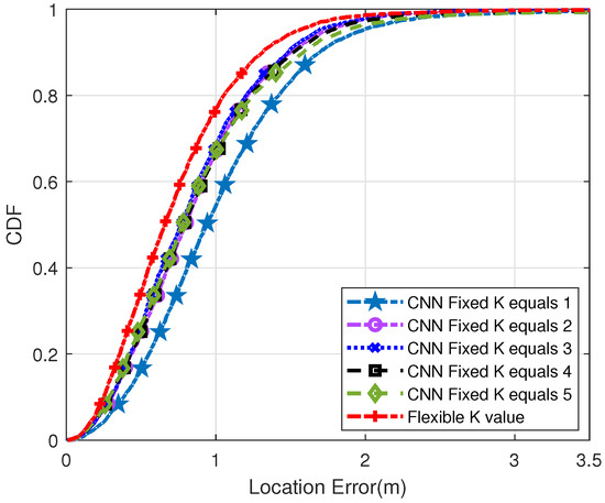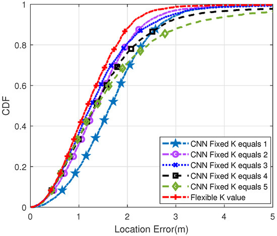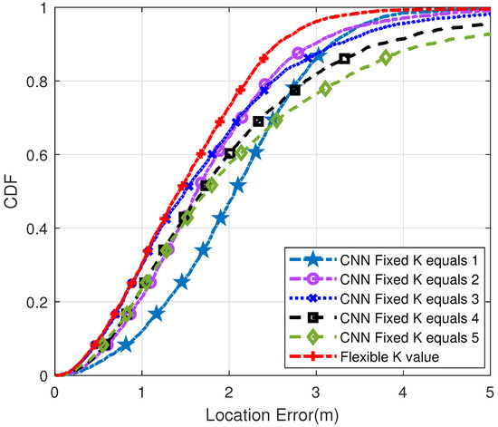 Figure 9 shows the CDF diagram when the distance between the reference points is 2 m. Compared with the above two points, the narrower the distance between reference locations, the higher the positioning accuracy and the better the effect. However, it takes extra time to build a more dense fingerprint database. In the proposed method, 77% of the test point positioning errors are less than 1m. When K is 1, 2, 3, 4, 5, the error of traditional CNN is less than 1 m, which is 19%, 31%, 37%, 66%, 67%, respectively. From the above experiments, it can be seen that the choice of K value has a significant impact on the calculation of the final position. In short, high positioning accuracy can be obtained by adaptive selection of appropriate K value.