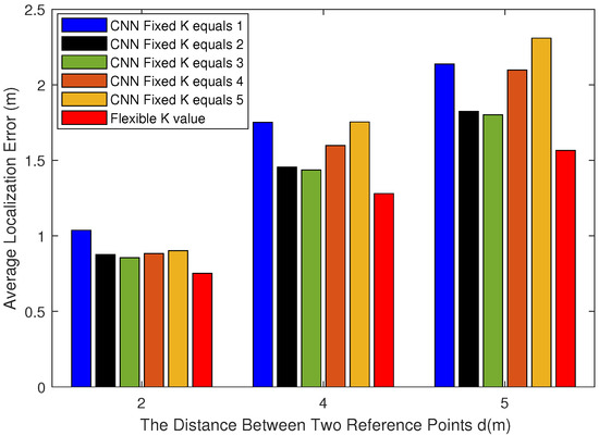 When the distance between reference points is small, the divided square area is denser. However, it takes more time to collect fingerprint database information in the offline phase. On the other hand, when the distance between reference points is the same, the average error of our proposed method is the lowest, and the positioning effect is better.