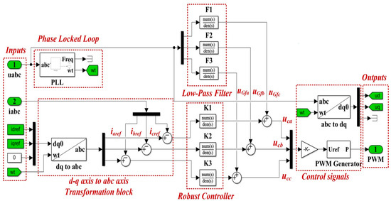 The elements in the block diagram are shown in the d-q frame, and to synchronize the voltage at the output of the DC-AC converter with the voltage supplied by the grid, references idref, iqref are set initially to 0, while the breaker is set to the closed position. The grid voltages are filtered by a low-pass filter to reduce harmonics and then supply a feed-forward to the robust controller outputs to obtain PWM modulation pulses for the DC-AC converter control.