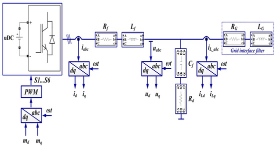 Starting from the diagram in Figure 10, where the notations are the usual ones in the d-q reference frame for the modulation indices, angular frequency, currents and voltages, the following equations can be written: