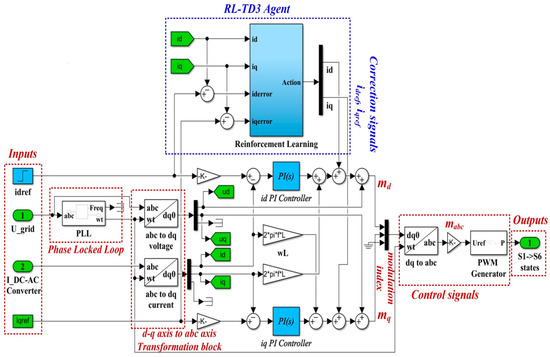 The details of the Matlab/Simulink implementation of the RL-TD3 agent for the correction of uaref, ubref,and ucref command signals are presented in Figure 7.
