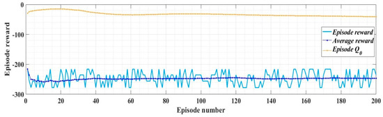 The time of the training stage for the implemented RL-TD3 agent for command signals correction of the robust controller is 2 h, 11 min, and 5 s. The sampling time of the RL-TD3 algorithm is 10−4 s, and the training stage is of 200 epochs.