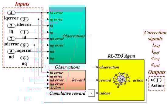 Figure 12 shows the details implementation of the RL-TD3 agent for the correction of idref and iqref signals, which is represented in the Reinforcement Learning subsystem shown in Figure 11.