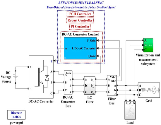 A combined control of the DC-AC converter system based on a robust controller and RL-TD3 agent can be proposed to improve the performance of the DC-AC converter control system. Among machine learning-based controls, the most suitable variant for industrial process control is provided by RL [24,25,26,27].
