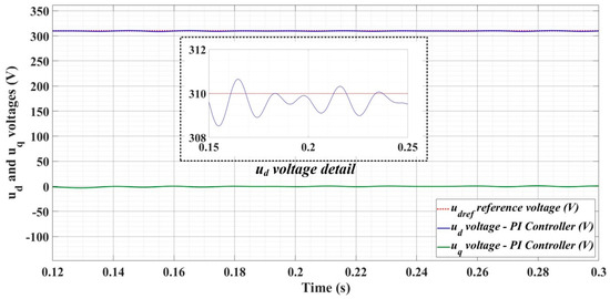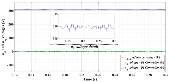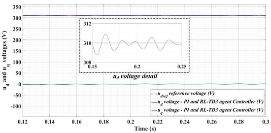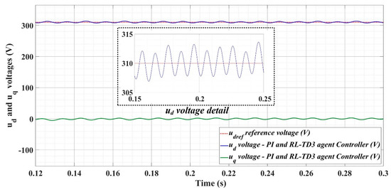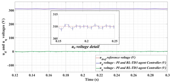 Thus, Figure 18, Figure 19 and Figure 20 show the time evolution of ud and uq voltages for the DC-AC converter control system based on the PI controller in the case when the load is balanced, unbalanced or nonlinear. Figure 21, Figure 22 and Figure 23, for the same types of load variation, show the time evolution of ud and uq voltages for the DC-AC converter control system based on the PI controller improved by using an RL-TD3 agent. Substantial improvement in control system performance can be observed when using PI control in combination with an RL-TD3 agent.