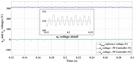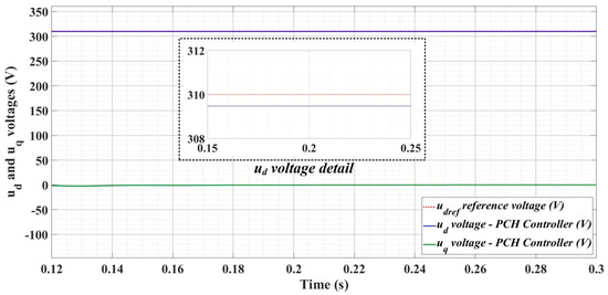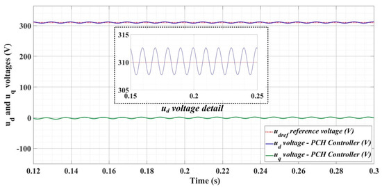 Figure 30, Figure 31 and Figure 32 show the time evolution of ud and uq voltages for the DC-AC converter control system based on the PCH-type controller in the case when the load is balanced, unbalanced or nonlinear.