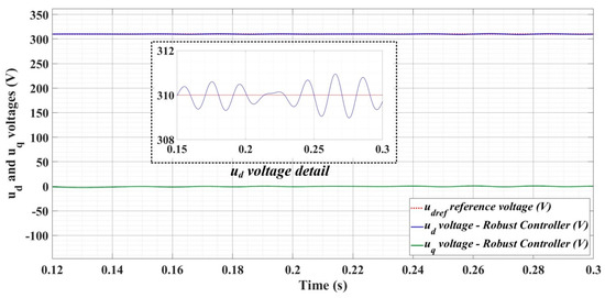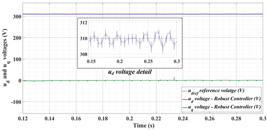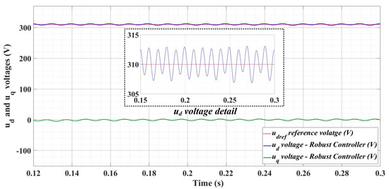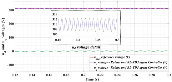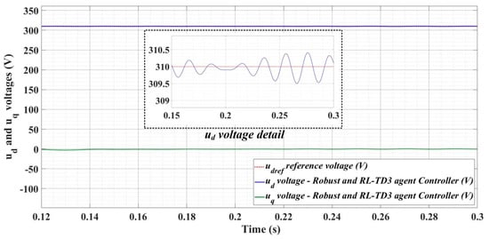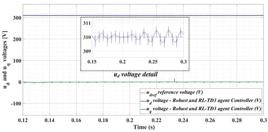 Figure 24, Figure 25 and Figure 26 show the time evolution of ud and uq voltages for the DC-AC converter control system based on a robust controller when the load is balanced, unbalanced or nonlinear. Figure 27, Figure 28 and Figure 29 for the same types of load variation, show the time evolution of ud and uq voltages for the DC-AC converter control system based on robust controller improved by using an RL-TD3 agent. Substantial improvement in control system performance can be observed when using the robust control in combination with an RL-TD3 agent.