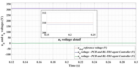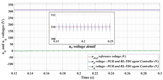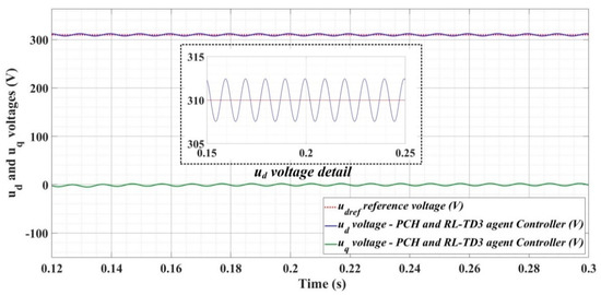 Figure 33, Figure 34 and Figure 35, for the same types of load variation, show the time evolution of ud and uq voltages for the DC-AC converter control system based on the PCH-type controller improved by using an RL-TD3 agent. Substantial improvement in control system performance can be observed when using PCH-type control in combination with an RL-TD3 agent.