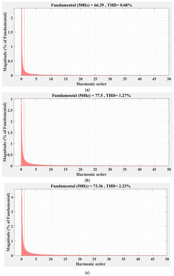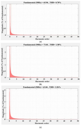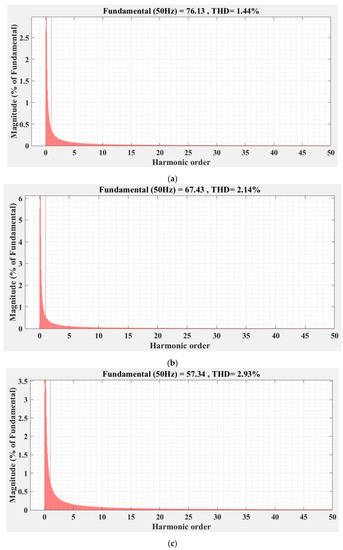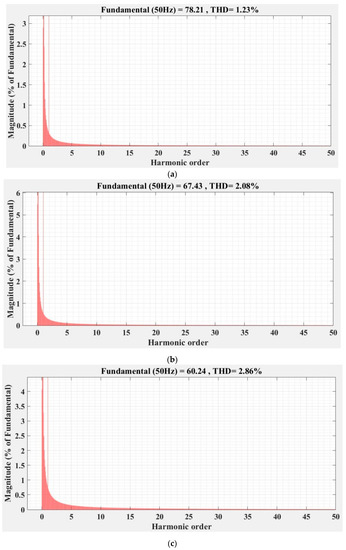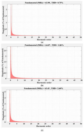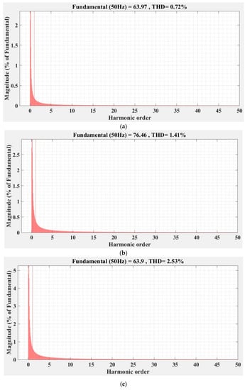 FFT analysis and THD for current phase a of the DC-AC converter controlled with PI-type controller: (a) balanced resistances for load; (b) unbalanced resistances for load; (c) nonlinear resistances for load.