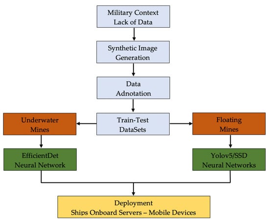 The framework structure of this research is straightforward (Figure 1). Due to the sensitive military context, limited data (sea mine images) are available online as much of them are classified. Thus, starting from the existing images, hundreds of synthetic images were generated and augmented for creating the training, testing and validation datasets. Subsequently, each image was annotated, and image datasets were created for both underwater and floating mines.