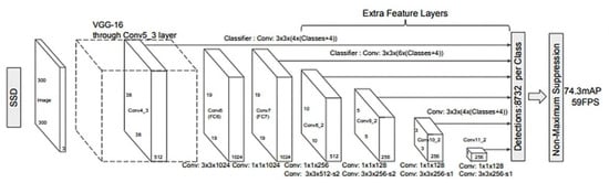 In 2016, a new model for object detection was proposed, SSD (Single Shot Multibox Detector), an appearance motivated by the fact that previous approaches were computationally expensive and too slow for real-time applications []. The model consists of a convolutional neural network resulting in a collection of rectangles for framing objects along the probability classes []. The architecture of the model is based on the VGG-16 network, without the layers fully connected (Figure 3). The VGG-16 network was chosen as a starting point due to its image classification performance as well as transfer learning. The SSD added a set of convoluted layers to extract features and reduced the size of the input for the next layer.