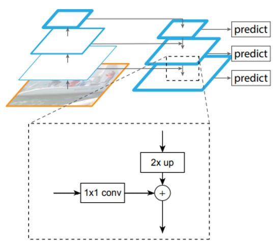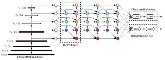 EfficientDet [] is one of the newest approaches to object detection, and the reason for its emergence is that existing, albeit highly accurate, networks have become costly in terms of resources and time. In the case of this network, the aim is to develop a model that takes into account both accuracy and efficiency, for results that can really be used in real time. The starting point of this model is the feature pyramid networks, known as FPN (feature pyramid network) (Figure 4). This network acts as a general solution for building feature pyramids within convolutional networks. The construction of the pyramid involves a top-down and a bottom-up path. The bottom-up method calculates a hierarchy of features consisting of a series of feature maps obtained in different proportions, with a scaling step equal to 2. To make the pyramid, a level is defined for each stage, and the exit of the last layer from each stage is used as a reference set for the next. Specifically, bottom-up feature maps go through 1 × 1 convolutions to reduce size. On the other hand, in the top-down method, the higher resolution features are more spatially distant but semantically stronger. Each side connection combines feature maps of the same spatial size from the bottom-up and top-down paths [].