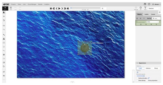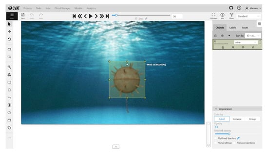 As deep learning is a supervised learning technique, the dataset must be annotated. Annotation is the process by which engineers or scientists frame objects relevant to the problem to be solved in rectangles, assigning them labels that identify them (Figure 9 and Figure 10). Along the way, several tools have been developed to help make this process easier. These include the open-source CVAT (Computer Vision Annotation Tool) program [] developed by Intel Co, which allows the export of annotations in various formats (PASCAL VOC, COCO, YOLO) depending on the network model used.