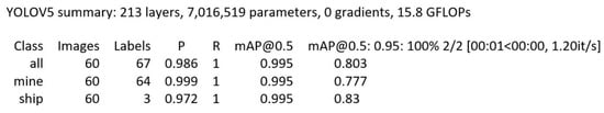 The YOLOV5 model training is based on two yaml files, using a batch size of 16, over a number of 500 epochs. The first file defines the location of the training and validation data along with the name and number of the classes (two classes—mine and ship). The second file contains the configuration of the network composed of three parts: (a) the backbone: CSPDarknet, (b) the neck: PANet, (c) the head: YOLO Layer. The data are first input to CSPDarknet for feature extraction, and then fed to PANet for feature fusion. Finally, YOLO Layer outputs the detection results (class, score, location, size).