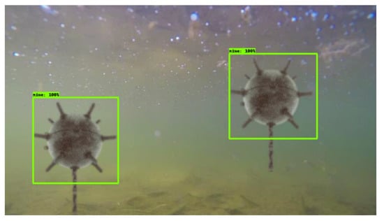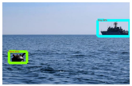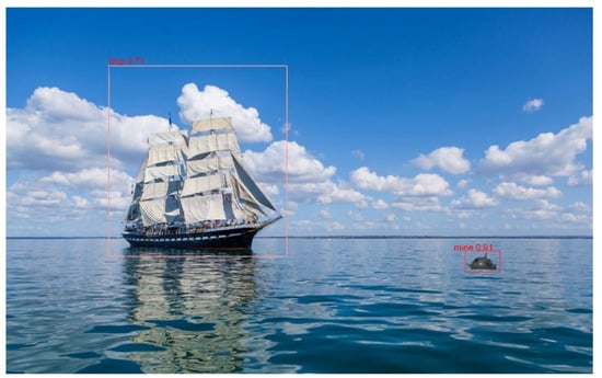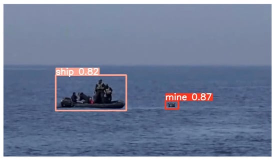 Since the YOLOv5 algorithm has the best results for mine detection, it was verified that the model is usable for real-time scenarios by using a Raspberry Pi board. The model used for testing has 4GB of RAM and a 1.5 GHz ARM Cortex-A72 processor with four cores. By running the script on a real-life video stream (https://files.ugal.ro/s/Tlr2zjiGxJEBcFQ, accessed on 10 June 2022), it was observed that the detection time per frame was approximately 2 s and that the detections were performed properly, both for the floating mine and for the ship in the area adjacent to it, see Figure 22.