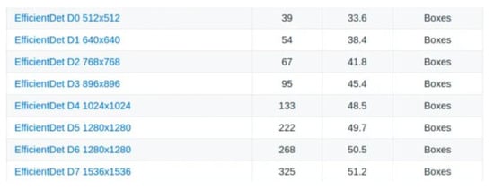 The EfficientDet model performs well, being initially evaluated on the COCO dataset and compared to a number of networks already known to be extremely efficient, such as YOLOv3 or RetinaNet. In particular, with single model and single scale, in [], the EfficientDet-D7 model achieves state-of-the-art 55.1 AP on COCO test-dev with 77M parameters and 410B FLOPs, being 4×–9× smaller and using 13×–42× fewer FLOPs than previous detectors.