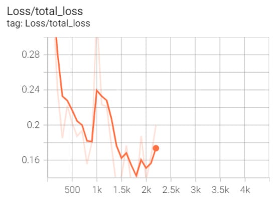 The EfficientDet model was pretrained in TensorFlow on the MSCOCO image database. For the current model development, it was necessary to generate the record files for training, testing and validation, with the underwater mine dataset being split in proportion of 60/20/20. At the same time, the file label_map was created, file containing the class to be detected. All the networks in the EfficientDet category are available, and for the current case the D0 512 × 512 option was chosen. Preparing the network for training consists of editing the configuration file by specifying the parameters of the detection in question. Thus, the values for the number of classes, batch_size, path to training and validation record files and the checkpoint from which the training begins.