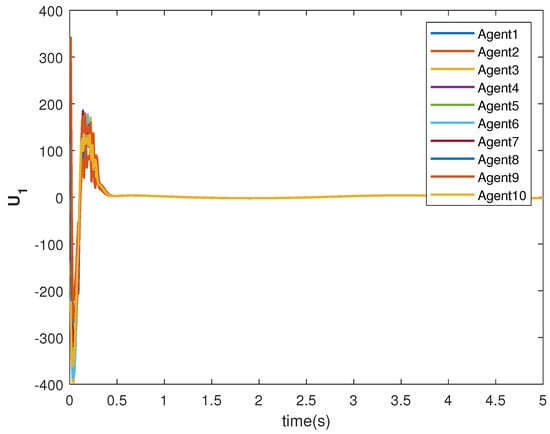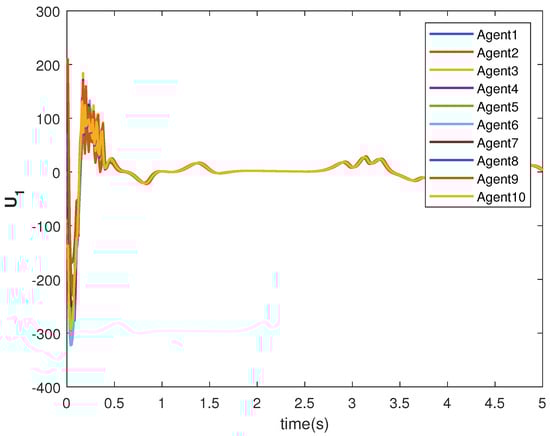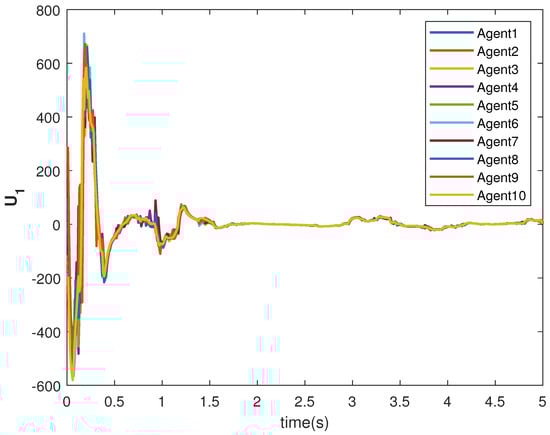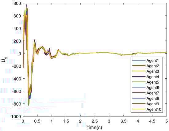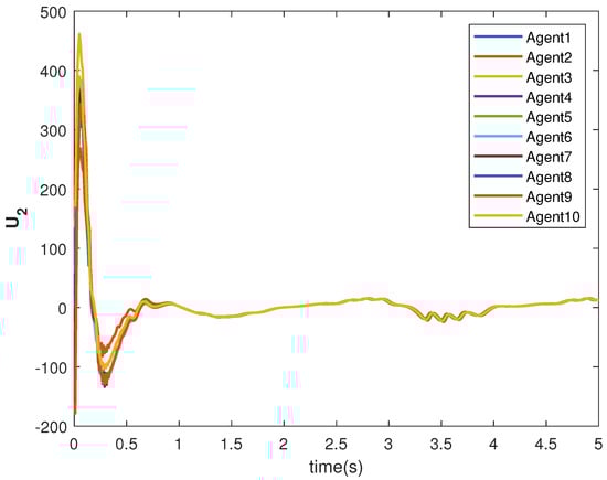 The consensus controls and are shown in Figure 7 and Figure 8, respectively. It can be observed that the control signals are different from case 1. This is due to the leader’s states, which are sinusoid in nature as given in Equations (40) and (41).