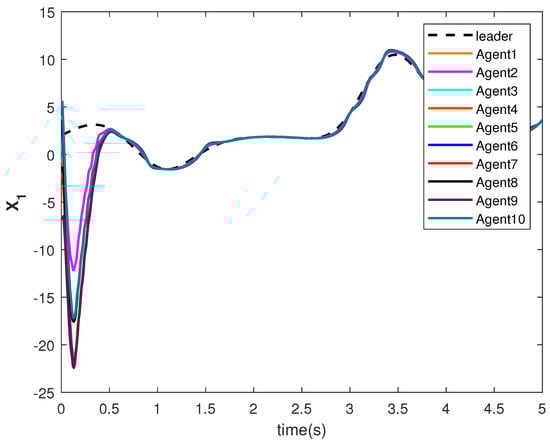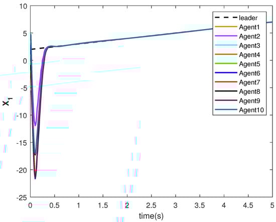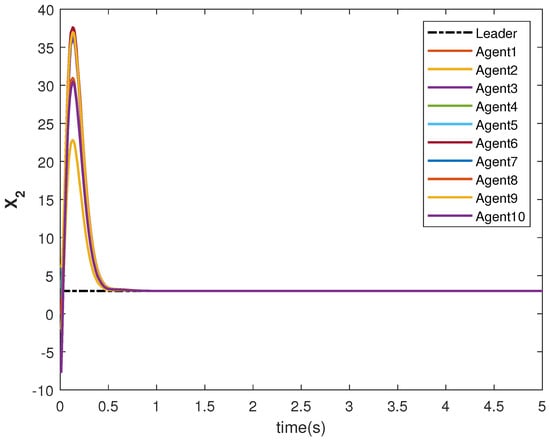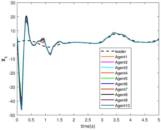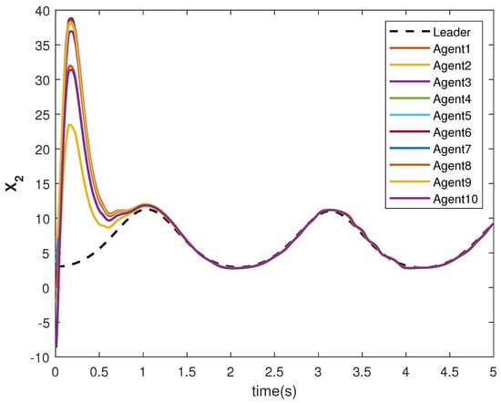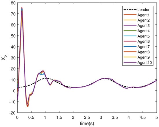 The state trajectories and are shown in Figure 9 and Figure 10, respectively. The agents achieve consensus on the leader’s trajectories. The leader’s states are different, but the consensus controller has managed to track them.