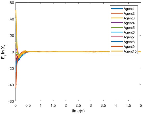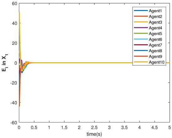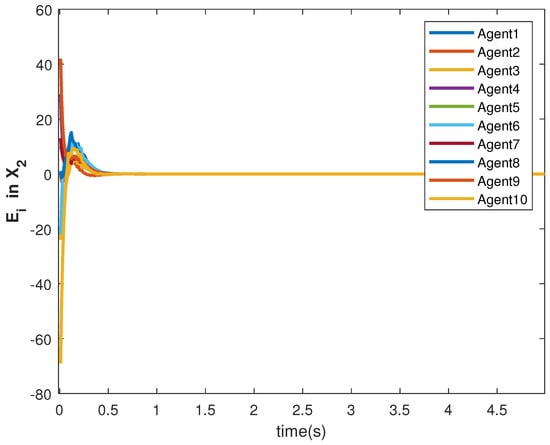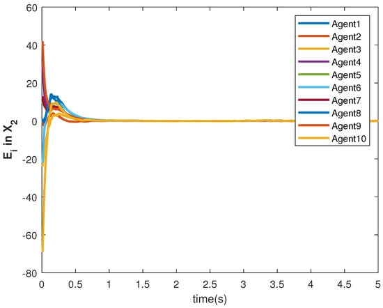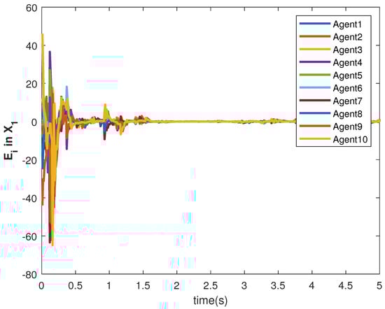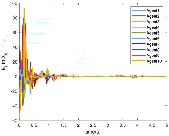 The accuracy of consensus tracking is described by the errors in and , which are shown in Figure 11 and Figure 12, respectively. The consensus tracking errors become zero in a few seconds, which explains the effectiveness of the proposed controller.