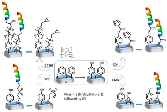 Utilization of polymer-based materials is continually evolving due to their cost and ease of mass production. Chemical functions of polymer supports allow the widening of their versatility in terms of compatibility, stability, and polarity [1]. The addition of these features will be appealing for applications in fields including biomedicine, microelectronics [2], and the textile industry [3]. Among the various polymer supports available, polystyrene (PS) has more applications in biomedical fields due to its optical transparency, good mechanical properties, and non-toxicity [4,5]. Controlled chemical and/or physical treatment of PS substrates leads to modified surface properties suitable for introducing chemical moieties. The treatment allows the utilization of groups with designed functionality to graft the surface with biomolecules. Consequently, a variety of methods have been reported for modification of PS substrates, including treatment with either piranha solution [6], irradiations with plasma [7], gamma [8], UV-Ozone [9], or electron beam [10]. In addition, the combination of piranha treatment and UV irradiation [11]; KOH treatment followed by O2 plasma [12]; and Ozone and UV irradiation in aqueous ammonia [13] are also common methods to oxidize PS substrates, usually resulting in OH and NH2 terminated surfaces for further functionalization. Consequently, a significant amount of literature has emerged to tailor surface properties of PS substrates for further activation with coupling agents. Hydroxyl terminated PS substrates are often functionalized with silicates/siloxanes [11,12]. There are limited reports on the use of activated PS to functionalize with cynogene bromide, carbonyl diimidazole, and divinyl sulfone [14,15]. The afore-mentioned coupling agent has a wider use in the functionalization of OH groups in sugar [16]; OH functionalized titanium oxide nanotube [17]; quartz/silica surfaces [18]. These coupling agents are known to offer highly reactive surfaces with the potential to anchor proteins, short peptides, and DNAs. The immobilization method chosen most of the time correlates with biomolecule activity, reproducibility, stability, and limits of detection of the biodetection strategy [19,20].
