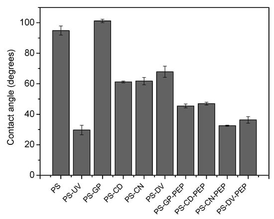 After modification of the surface, the contact angle of water drops on the various PS substrates provided rapid information on the nature of the modification hydrophilicity/hydrophobicity and extent of roughness. The water contact angle of the various modified PS substrates is described in Figure 2.
