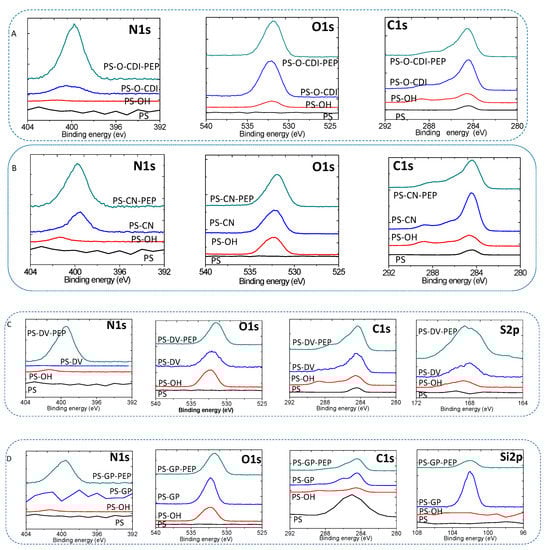 The XPS spectra depicts the N1s, O1s, C1s, and S2p core levels for the various substrates functionalized by the methods under study. (A) series represent the XPS spectra of –CDI-PEP modified PS. (B) are the XPS spectra of –CN-PEP modified PS. (C) are the XPS spectra of –DV-PEP modified PS. (D) are the XPS spectra of PS GP modified PS.