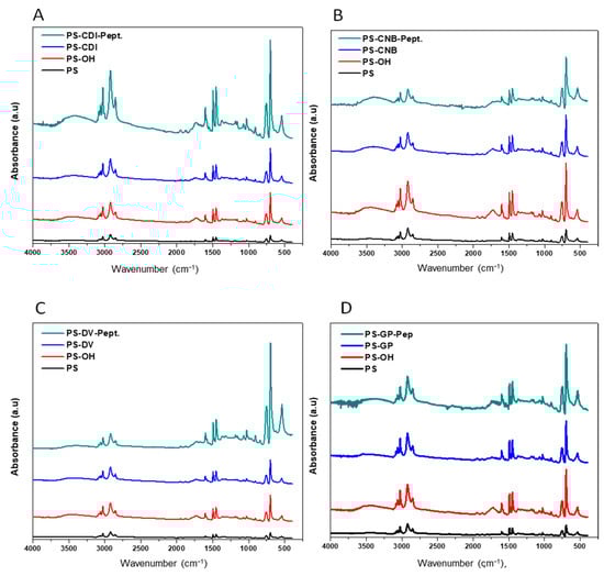 The ATR FT-IR of the various PS surfaces following activation with UV piranha, coupling agents and peptide coupling: (A) CDI modified PS. (B) CNB modified PS. (C) DVS modified PS. (D) GPTS modified PS.