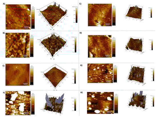 Atomic force microscopy (AFM): An Asylum MFP 3 D Infinity microscope (Oxford Instruments, Abingdon, United Kingdom) was used to perform AFM characterization of surfaces. Tests were carried out using a tapping mode, allowing to obtain the topography of sample surfaces. Images of 2 × 2 µm2 were then obtained using a silicon probe (AC160R3-TS from Asylum). Mean roughness (Ra) and root mean square roughness (Rq) of images were then measured for each sample surface. Images different zones of the surface were characterized for each sample in order to verify repeatability of results.