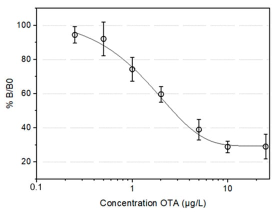 OTA calibration curves in PBS on 96-well plate. Competitive ELISA for the detection of OTA in PBS were performed with a concentration of peptide SNLHPK (1 µg/mL) for a concentration of OTA-HRP labeled at 1000 µg·L−1. B and B0 represent the bound enzyme activity measured in the presence or absence of competitor respectively. Each point is the average ± standard deviation of three independent assays each with 4 measurement (n = 12).