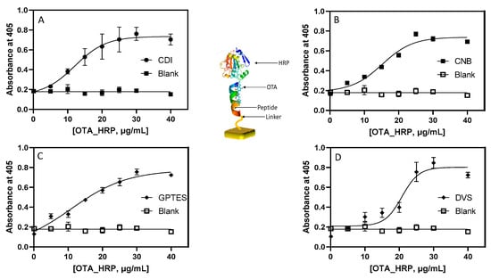 Binding curve for serial dilutions OTA-HRP (in 10 mM PBS pH 7.4) to cuvettes functionalized with 2 mg/mL of the peptide SNLHPK. (A) CDI modified PS. (B) CNBr modified PS. (C) GPTS modified PS. (D) DVS modified PS. In all experiments, the blank is the solution of unconjugated HRP.