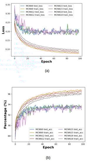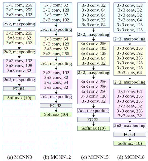 where i and j represent, respectively, index samples and classes. N is the number of samples, K is the number of classes, is the label, and is the softmax prediction. Comparing the performance of the MCNN model, a different number of convolutional layers, which included three (MCNN9), four (MCNN12), five (MCNN15), and six (MCNN18) convolutional layers in each convolutional layer group, are designed and tested (see Figure 1).