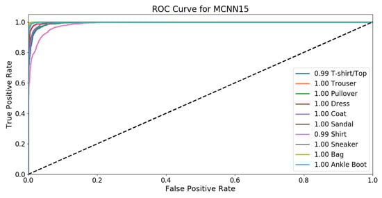 The area under the receiver operating characteristic (ROC) curve for MCNN15 is 0.998 (see Figure 5); that described work has high performance. The area under the ROC curve (AUC) calculation summarized the ROC curve analysis into a scalar value, which ranges between 0 and 1. The nearer the AUC score to value 1, the better the application’s overall performance.