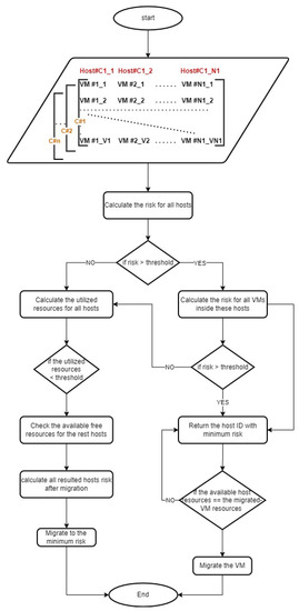 In the event that there are no hosts with a high risk level, the migration sub-module starts to analyze the host utilization levels and selects the host with a resource utilization level lower than a threshold value. The hosts’ utilization threshold value is determined based on the percentage of used resource capacity. We assume that a resource utilization threshold value of 30% can be easily distributed to the rest of the hosts to maximize cloud resource utilization. The VMs deployed on this selected host are considered to be migrated.