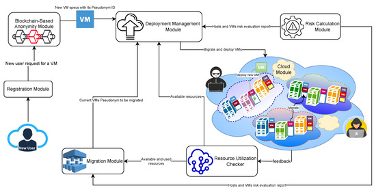 The proposed system consists of five main modules: a registration module, a blockchain-based anonymity module, a deployment management module, a risk calculation module and, finally, cloud modules, as shown in Figure 3. In the following sub-sections, we discuss each of the modules in detail.