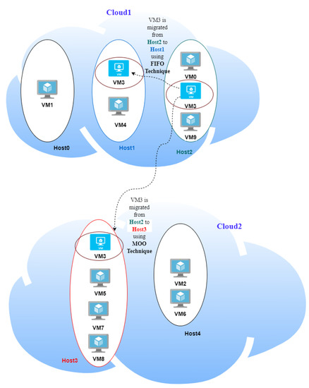 The computational results show the impact of applying an adaptive moving-target defense model (AML) relying on a self- and situation-aware decision-making mechanism to enhance security measurement levels. A Python-based simulation is used to evaluate the effectiveness of the presented approach to enable security-aware and virtual machine consolidation for efficient resource utilization in the federation. The cloud example model in the evaluation results section assumes two clouds working as a federation; the first has three hosts (Host0, Host1, Host2), while the second has two hosts (Host3, Host4). On these hosts, ten different VMs (VM0, VM1,…, VM9) are distributed, as shown in Figure 4. A primary Linux OS is installed in each VM in the used cloud. Additionally, each VM includes a backup Windows OS. We studied two types of vulnerabilities that threaten the cloud model: side-channel vulnerability and OS-specific vulnerabilities.