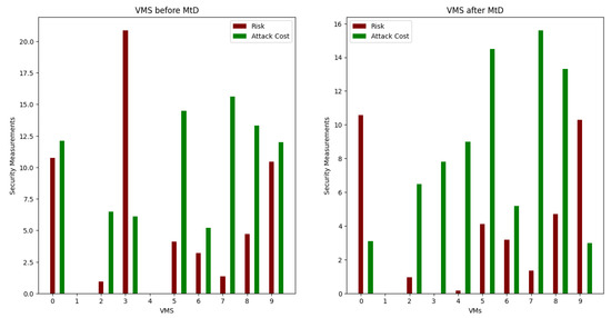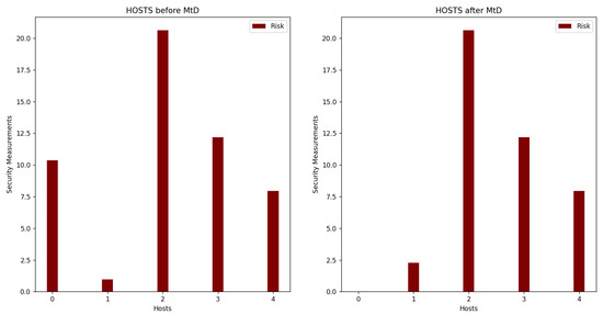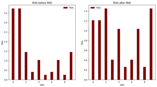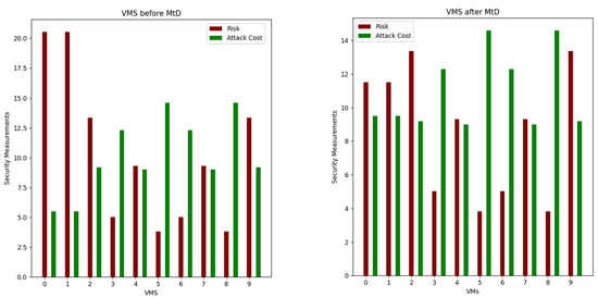 The system starts by calculating all security metrics for all hosts and VMs. For the host exceeding the security metrics threshold, its VMs will be selected for migration. The system will apply OS diversity on VM with the highest base score value. In addition, it will be migrated to another host with lower risk. In this scenario, the migrated VM is VM1 with the highest CVSS base score and will be migrated to Host1. As shown in Figure 7, the risk of VM1 decreased after changing the OS of VM1 and migrating VM1 to Host1. Figure 8 shows the values of the total risk of hosts before and after applying MtD. The total risk of Host0 is now zero due to migrating all its hosted VMs, while the total risk on Host1 has slightly increased due to adding a new hosted VM (VM1). Figure 9 shows the ROA results before and after applying MtD. The RoA of VM1 is decreased due to decreasing its total risk value after applying MtD.