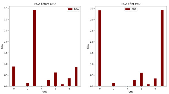 Table 5 and Table 8 show the calculation results for total risk, total attack cost and return-on-attack (ROA) for each VM before and after applying the shuffle MtD. These values indicate that the risk and ROA values are improved after applying the shuffle MtD techniques. As shown in Figure 5, the total risk of VM3 decreased because the new host (Host1) has a low-risk value. Consequently, the ROA of VM3 is also decreased, which indicates that the probability of attacking this VM is low, as shown in Figure 6.