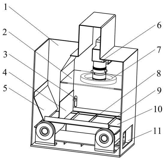 Structure diagram of infusion-type sampling device. (1) Inlet, (2) dust baffle, (3) flow-rate-adjustment lever, (4) deflector, (5) baffle, (6) camera, (7) light source, (8) conveyor belt, (9) corrugation, (10) transparent platen, and (11) outlet.