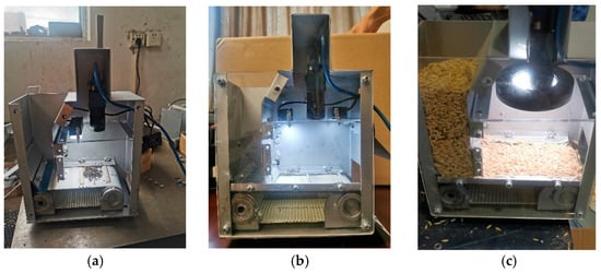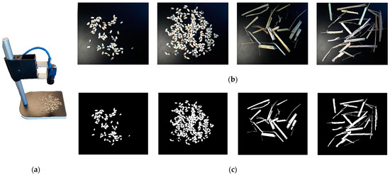 The machine vision method is well adapted to the material and is the main method to visualize the quality of the grain. Wallays et al. developed a machine-vision-based wheat impurity rate detection sensor that can monitor the impurity rate of harvested wheat online and display the monitored value on an interface [14]. Mahirah et al. designed a dual-light-source impurity detection device and its accompanying image processing algorithm for detecting impurities and broken kernels in grains with a measurement accuracy of >75% [15,16]. Pourreza et al. investigated the distinction between wheat seeds and impurities in texture features and used a linear judgment analysis classifier to classify the features with 98.15% accuracy in impurity differentiation [17]. Kayabasi et al. produced a wheat seed dataset using ANN neural network and Bayesian regularization learning algorithm from the length, width, area, and perimeter to provide a machine vision system equipped with dual illumination and image-processing algorithms for detecting and measuring undesirable objects and damaged grains in harvested rice grains [18]. Chen et al. optimized the irradiation and installation method of the LED light source to obtain high-quality images by image histogram, identified the grain and impurity morphologically, and measured the thousand-grain mass, stalk surface density, and fine stalk line density of rice at the same time, and established a mathematical model to calculate the impurity mass of grain. The visualized tree was used to classify the particles labeled in the binary image, so the impurity in a range of 0 to 2.88% can be monitored [19,20,21]. Momin et al. used the HSI color model to segment the image background and, subsequently, of soybean, dockage fractions were detected using median blurring, morphological operators, watershed transformation, and component labeling based on projected area and circularity; the identification accuracy of dockage fractions was 96% [22].