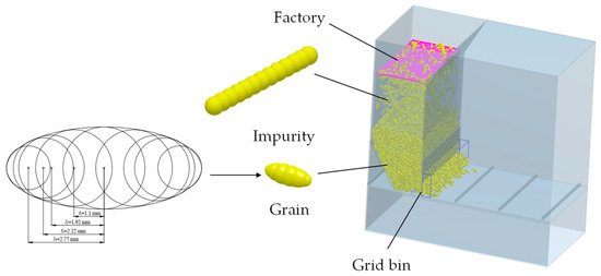 The distribution behavior of the grain in the sampling device was further studied by DEM. The 3D computer-aided design (CAD) models of the sampling device were imported into the DEM software EDEM 2018 (DEM Solutions Limited, Edinburgh, UK). The 3D simulation models and boundary conditions were determined by geometry parameters and working parameters, respectively. The material other than grain (MOG) in the grain bin mainly includes cylindrical short stem and fine light residual. The mutual occlusion between short stem and rice was mainly investigated because the occlusion between the fine light residual and rice can be neglected. A 9-sphere filling model was constructed to simulate rice in this paper. The outer envelope of the 9 spheres was ellipsoidal with a long axis of the ellipse 7.20 mm and a short axis 3 mm. The sphere was symmetrical from left to right, the distance from the center of the left 4 spheres to the center of the ellipsoid was 1.10 mm, 1.92 mm, 2.2 mm, and 2.77 mm, respectively, and the spheres’ radius from left to right was 0.80 mm, 1.10 mm, 1.20 mm, 1.40 mm, 1.50 mm, 1.40 mm, 1.20 mm, 1.10 mm, and 0.80 mm, respectively [24]. The short stalk model is filled with multiple spheres with a cylindrical outer envelope of 35.00 mm in length and 3.40 mm in diameter [25]. The simulation model is shown in Figure 4.