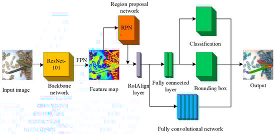 Each ROI predicts an output of K * m2 dimensions through the mask branch and it encodes K binary masks with a resolution of m*m, corresponding to K classes. Then each pixel was classified by the activation Sigmoid function. The classification branch calculates the category of the candidate region and the regression branch calculates the location bounding box of the candidate region. The class, location, and profile of the impurity could finally be detected by the FCN.