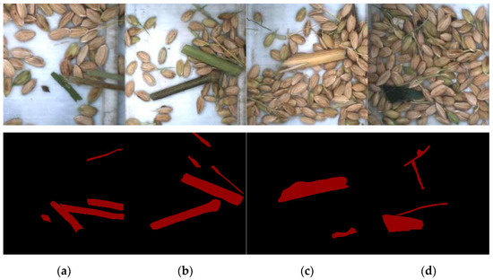 The captured grain image and the impurity mask image. (a) Fine impurities; (b) coarse impurities; (c) impurities approximating the color of rice; (d) irregular shape impurities.