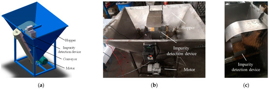 Technologies, such as machine vision and spectral detection, have been applied to distinguish and quantify the rice and impurity in the grain [9]. The spectral detection method can overcome the effect of material masking, but its adaptability to the random state of the material is weak, such as material moisture content and maturity [10,11]. Yu et al. used a convolutional neural network to process hyperspectral images to achieve a nondestructive detection of imperfect grains and the overall recognition rate of the test set reached 99.98% [12]. Chen et al. preferred the characteristic wavelengths of wheat sample spectra with different indicators by principal component analysis and contribution weight coefficients, and a least squares support vector machine was applied to construct inverse models of the impurity rate of wheat samples based on different indicators. The experimental results showed that the modeling coefficient of determination of the inverse model of impurity rate was greater than 0.9, the validation coefficient of determination was greater than 0.85, the root mean square error was less than 0.29, and the relative analysis error was greater than 2 [13].