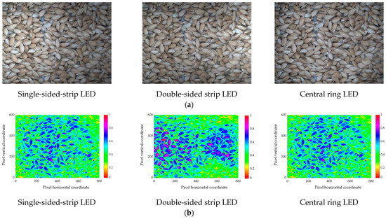 The grain images captured under different light irradiations are shown in Figure 9a. The distributions of the V component are shown in Figure 9b. Under the single-sided-strip LED, the V value on the LED side was significantly higher than on the other and the distribution of the V value was disproportionate. Under the double-sided-strip LED, the V value was higher on the two sides and lower in the central region. Under the central-ring LED, the peripheral V value was lower than the central area.
