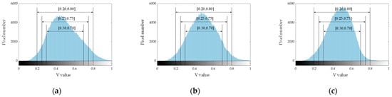 To further quantify and analyze the effect of light irradiation on the image brightness, the V value of each pixel in the image was counted. The V value distribution histogram under light irradiation is shown in Figure 10. The higher the proportion of lightness around the median value (V = 0.5) and the smaller the coefficient of variation of the overall lightness, the more suitable it is for subsequent image processing. The V value percentage in a range of [0.30, 0.70], [0.25, 0.75], and [0.20, 0.80] and the coefficient of variation of the V value were calculated and the results are shown in Table 4.