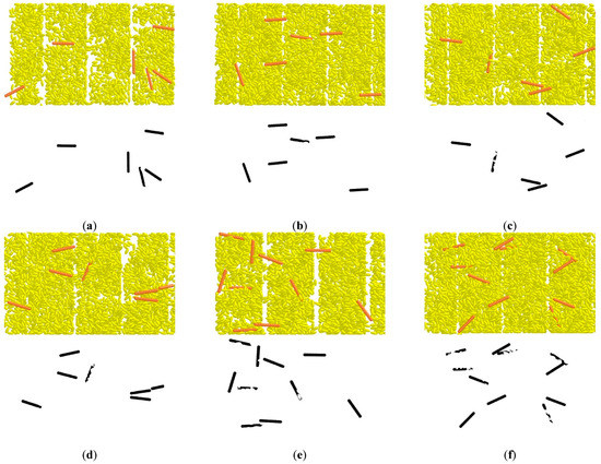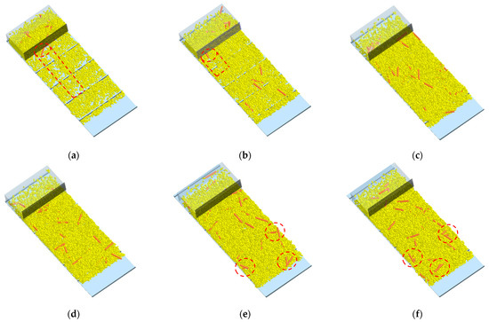 Impurity visualization analysis under different deflector gap. (a) d = 7.5 mm, S = 2.73%, (b) d = 10 mm, S = 3.75%, (c) d = 12.5 mm, S = 6.92%, (d) d = 15 mm, S = 9.54%, (e) d = 17.5 mm, S = 12.10%, (f) d = 20 mm, S = 18.11%.