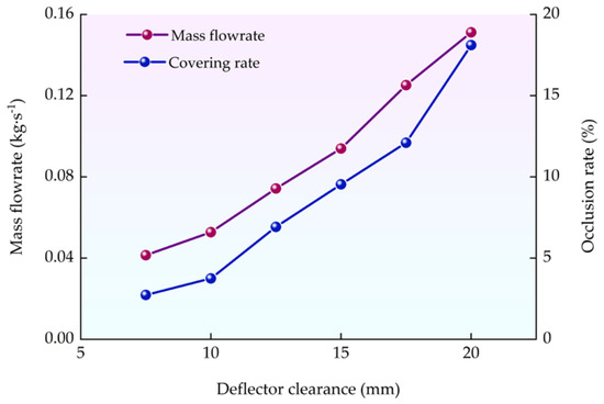 Combining the above results, the variation in impurity occlusion rate and grain mass flow rate with the deflector gap is shown in Figure 14. The grain mass flow rate and impurity occlusion rate both increase when the deflector gap increases. The detection efficiency could be improved by enhancing the deflector gap but the impurity identification accuracy decreases at the same time. The deflector gap was determined to be 15 mm to ensure detection accuracy while maximizing sampling efficiency. The sampling efficiency was 0.094 kg/s at this deflector gap.