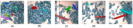 Impurity segmentation result. Masks are shown in color and confidences are also shown. (a) High impurity rate and dense rice; (b) low impurity rate and dense rice; (c) high impurity rate and sparse rice; (d) low impurity rate and sparse rice; (e) large size impurity.