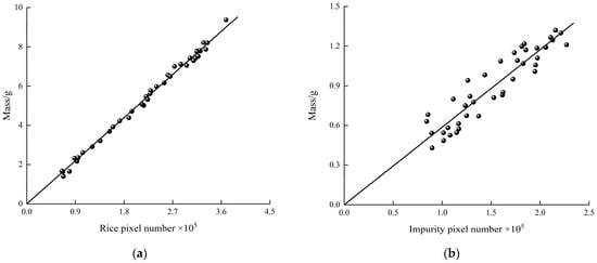 R-square (coefficient of determination) and RMSE (root mean squared error) were used to evaluate the fitting results. The R-square and RMSE of regression Equation (13) are 0.9949 and 0.1626, and regression Equation (14) is 0.8604 and 0.1013, respectively. Therefore, the rice pixel density ρr and impurity pixel density ρi are 2.4401 × 10−5 g/Pixel, 0.5867 × 10−5 g/Pixel, respectively. The accuracy for the rice pixel density is higher than that of impurities. It is because the proportion of different types of impurities affects the pixel density.